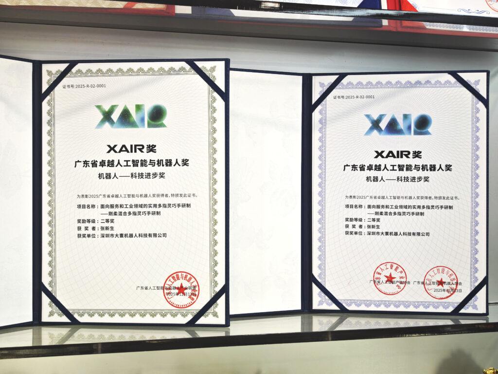 在“2025年度广东省卓越人工智能与机器人奖(XAIR奖)”评选中,大寰机器人凭借“面向服务和工业领域的实用多指灵巧手研制——刚柔混合多指灵巧手研制”项目获得XAIR 机器人——科技进步奖。