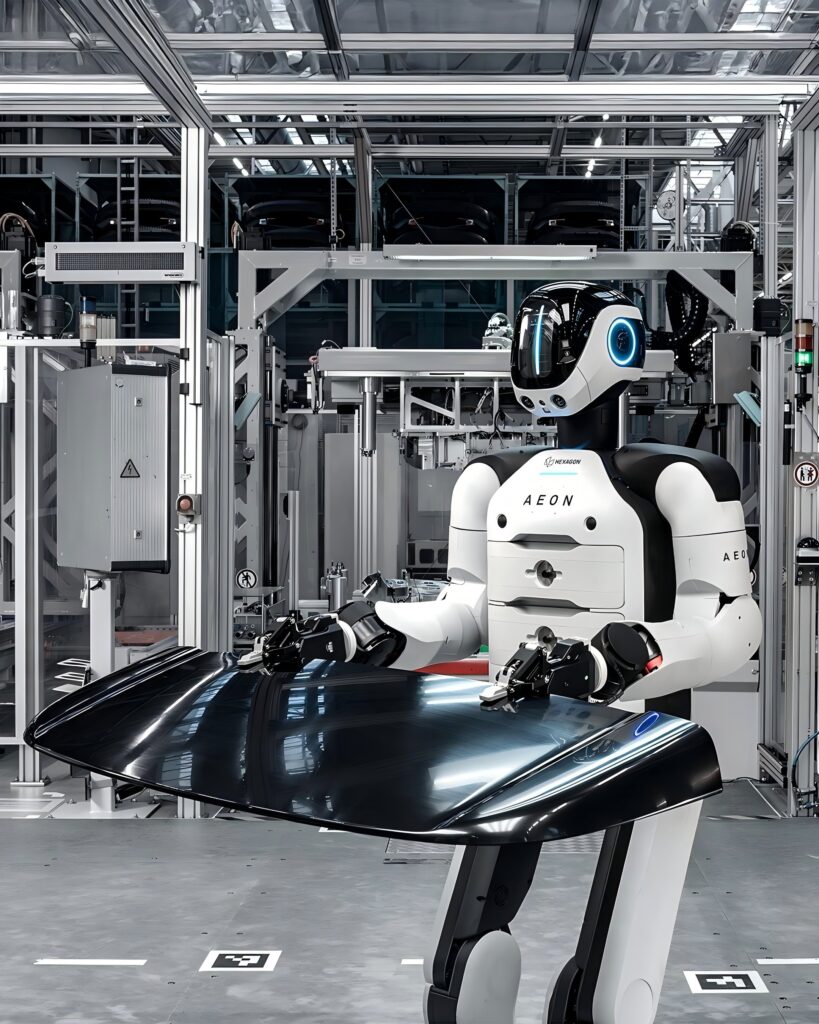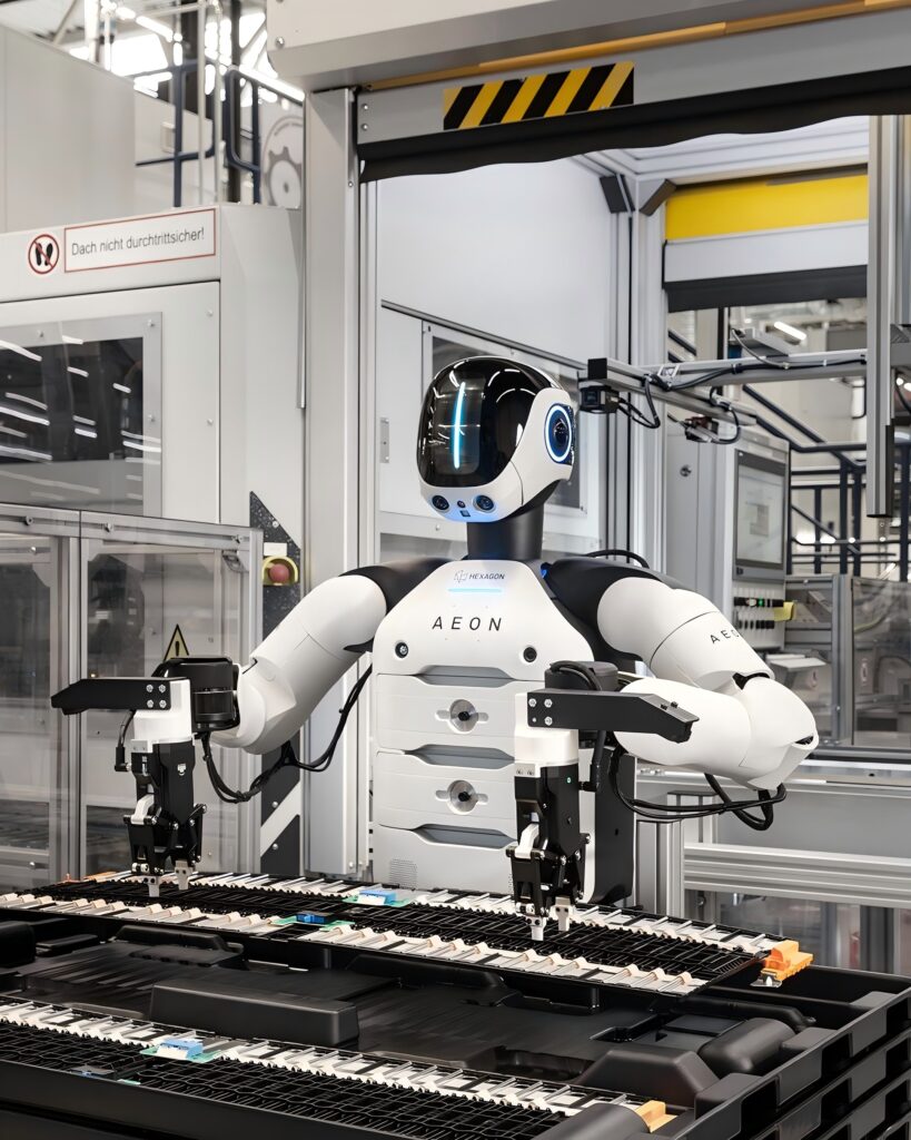 在此次试点应用中,大寰机器人AG系列电动夹爪,搭载于瑞典海克斯康公司(Hexagon Robotics)人形机器人产品AEON,作为末端执行机构,承担电池装配与零部件制造环节的关键操作任务。