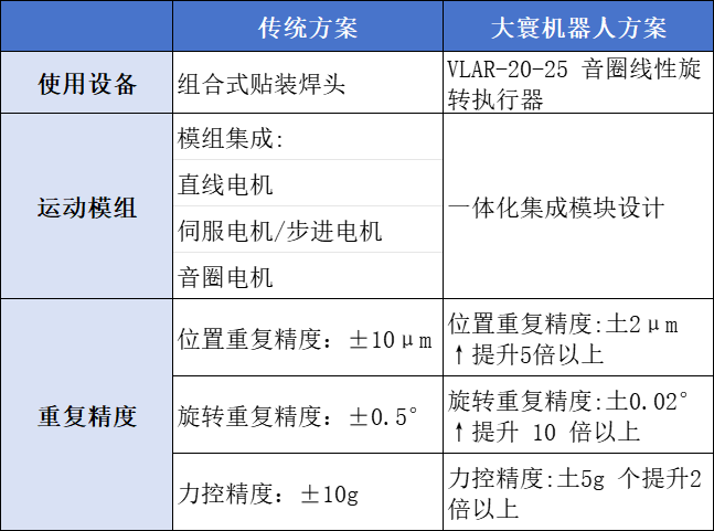 微型电子零部件,对生产组装要求极高,如摄像头模组组装。大寰机器人的音圈线性旋转执行器±5g的精确力控和软着陆有效防止零件损坏;±0.02°的旋转重复定位精度,确保定位组装的准确,提高整体组装生产的良率。