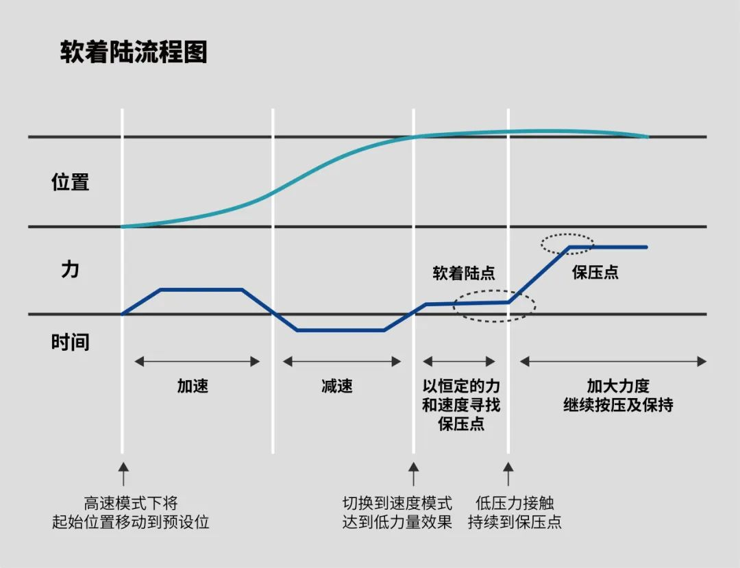 “软着陆”目的是在执行部件与加工零件接触的过程中,实现力度可控,防止出现器件损坏或者由于压力产生的其他问题。